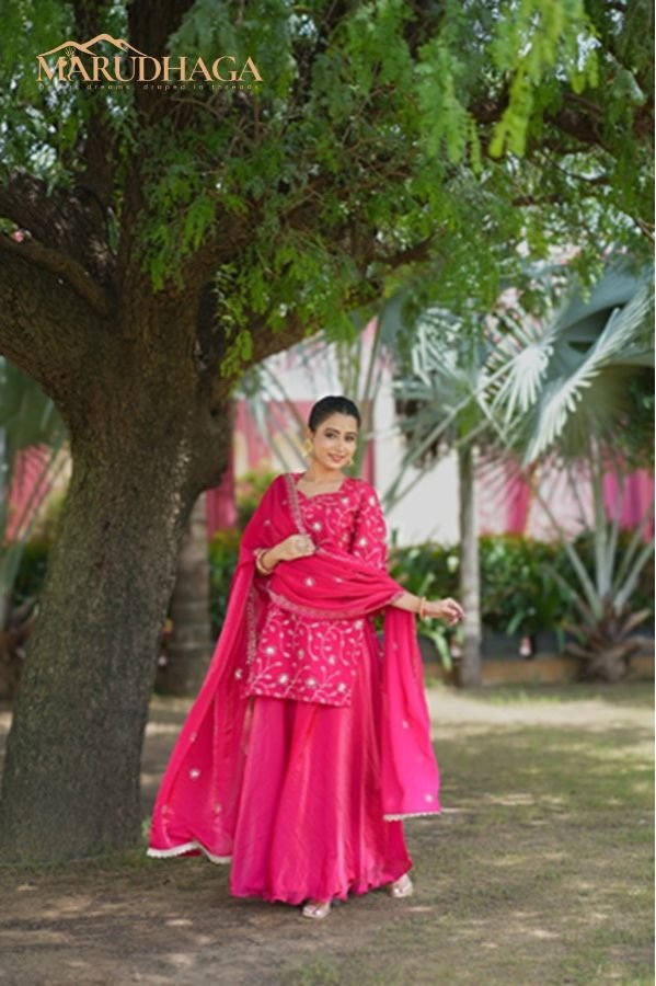 As a pink sharara set for wedding wear, this is designed to match the grandeur and warmth of Indian celebrations. Pink symbolises joy, romance and new beginnings—ideal for wedding rituals, mehendi ceremonies or reception parties. The flared sharara makes an entrance when you walk into the room, while the fitted top gives structure, flattering for all body types. The dupatta completes the look, adds drape and elegance.