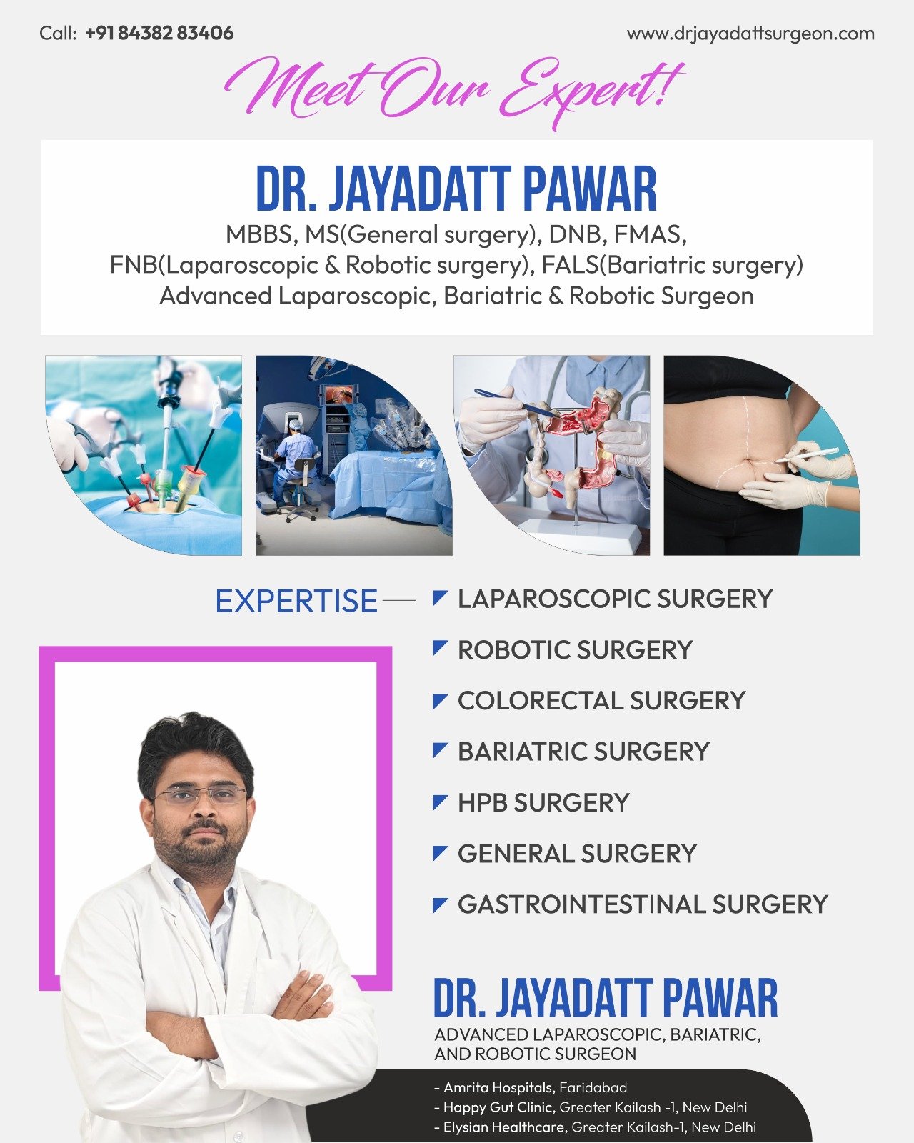 Dr. Jayadatt Pawar is a highly reputed Robotic & Laparoscopic Surgeon in New Delhi with over 15 years of extensive experience in advanced minimally invasive surgeries. He serves as a Consultant Advanced Laparoscopic, Bariatric & Robotic Surgeon at Amrita Hospitals, Faridabad, and Elysian Healthcare & Happy Gut Clinic, Greater Kailash, New Delhi. Renowned for his precision and patient-focused approach, Dr. Pawar has successfully performed thousands of complex laparoscopic and robotic procedures with excellent outcomes.