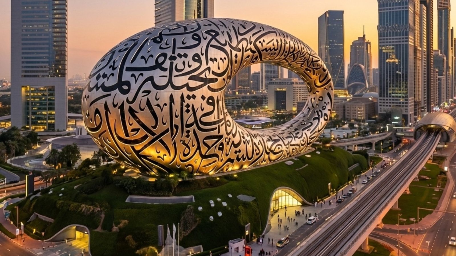 The structure features flowing curves and Arabic calligraphy carved into steel. Yes, it looks insane in photos. No, photos don’t do it justice.