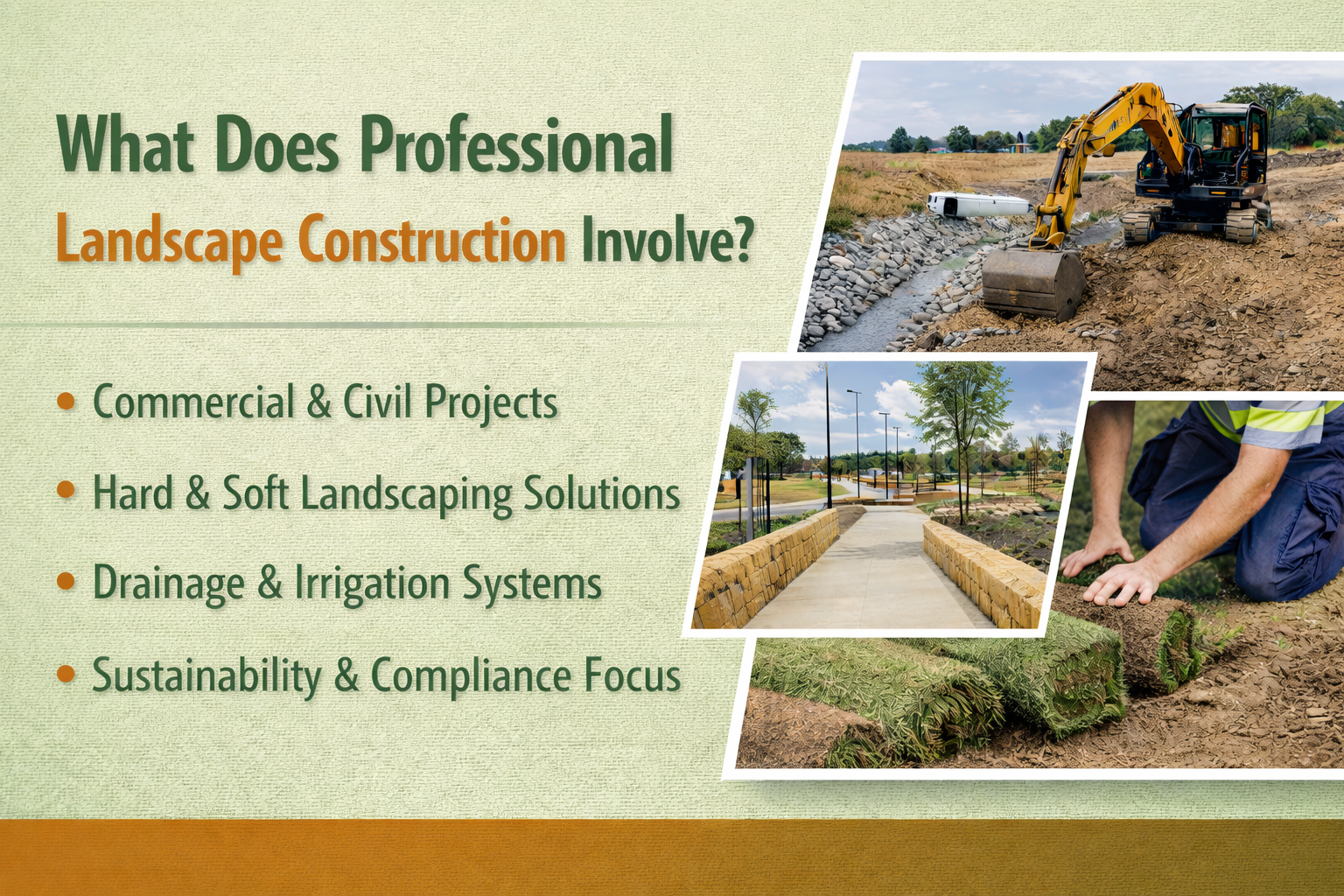 In commercial and civil settings, landscape construction supports safety, accessibility, drainage, environmental outcomes, and long-term asset value. Every element must align with construction drawings, engineering requirements, and regulatory standards.