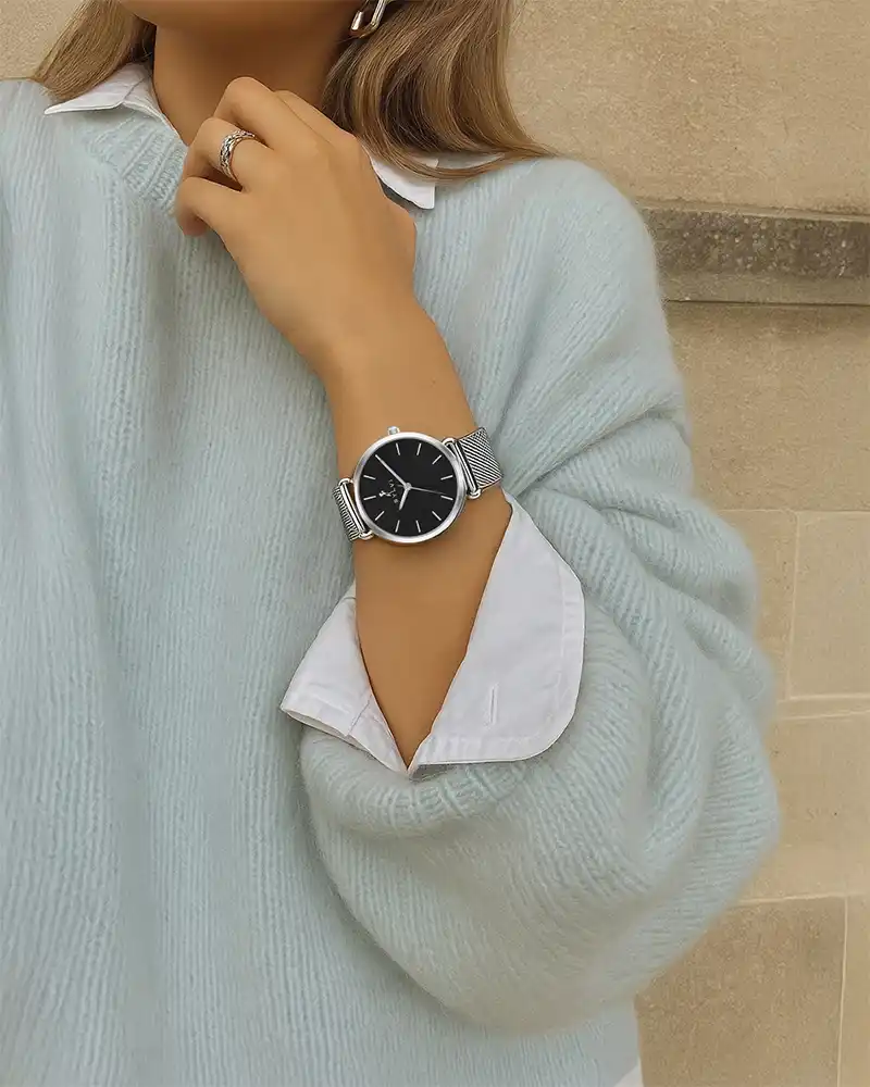 Sylvi designs a minimalistic, confident, and daily chic watch to women.The Serene Black Silver Mesh Women Watch is a beautiful representation of that philosophy- where there is clean design and a lot of comfort. The modern Indian woman is the target market of this women wrist watch, which will match a smooth black watch face with a polished silver stainless steel mesh strap giving it a sophisticated, yet casual look. On the one hand, when you want to have minimalistic watches with female lightness on the wrist, on the other hand, when these watches are elegant, elegant, and powerful is the best option; the item is called Serene Black Silver Mesh.